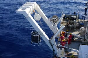Déploiement d’une rosette “Trace Metal Clean” à proximité de l’île Marion, dans l’archipel sud-africain du Prince-Edouard, afin de collecter des échantillons pour l’analyse des métaux traces. Cette couronne de bouteilles échantillonneurs Niskin est utilisée pour prélever l’eau à différents niveaux de profondeur. Les bouteilles sont descendues ouvertes et refermées aux profondeurs souhaitées, grâce au câble électroporteur qui relie la rosette au navire. Cette image a été réalisée dans le cadre de l’expédition océanographique SWINGS dans l’océan Austral. Son objectif est de mieux comprendre la séquestration du CO2 atmosphérique dans l’océan, en particulier la manière dont des éléments chimiques essentiels à ce stockage sont apportés, transportés et transformés par les océans. Elle s’inscrit dans le programme mondial Geotraces pour la construction d’un atlas chimique des océans. Trois programmes ont aussi embarqué à bord du Marion Dufresne : le service d’observation Oiso, qui évalue la part de CO2 issue des émissions anthropiques et l’acidification des eaux qui en résulte, Themisto qui étudie les écosystèmes de haute-mer et MAP-IO, qui effectue des mesures physiques de la distribution des aérosols et de gaz traces. UMR5566 Laboratoire d’Etudes en Géophysique et Océanographie Spatiales ,UMR6539 Laboratoire des sciences de l’environnement marin 20210056_0019