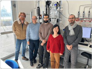 LEMTA team involved in the project in front of the experimental bench developed to test materials at high pressure and high temperature. From right to left: Giuseppe Sdanghi (Junior Professor), Feina Xu (CNRS researcher), Wissem Abderrahmane (PhD student), Jérôme Dillet (Research engineer), Gaël Maranzana (Professor)